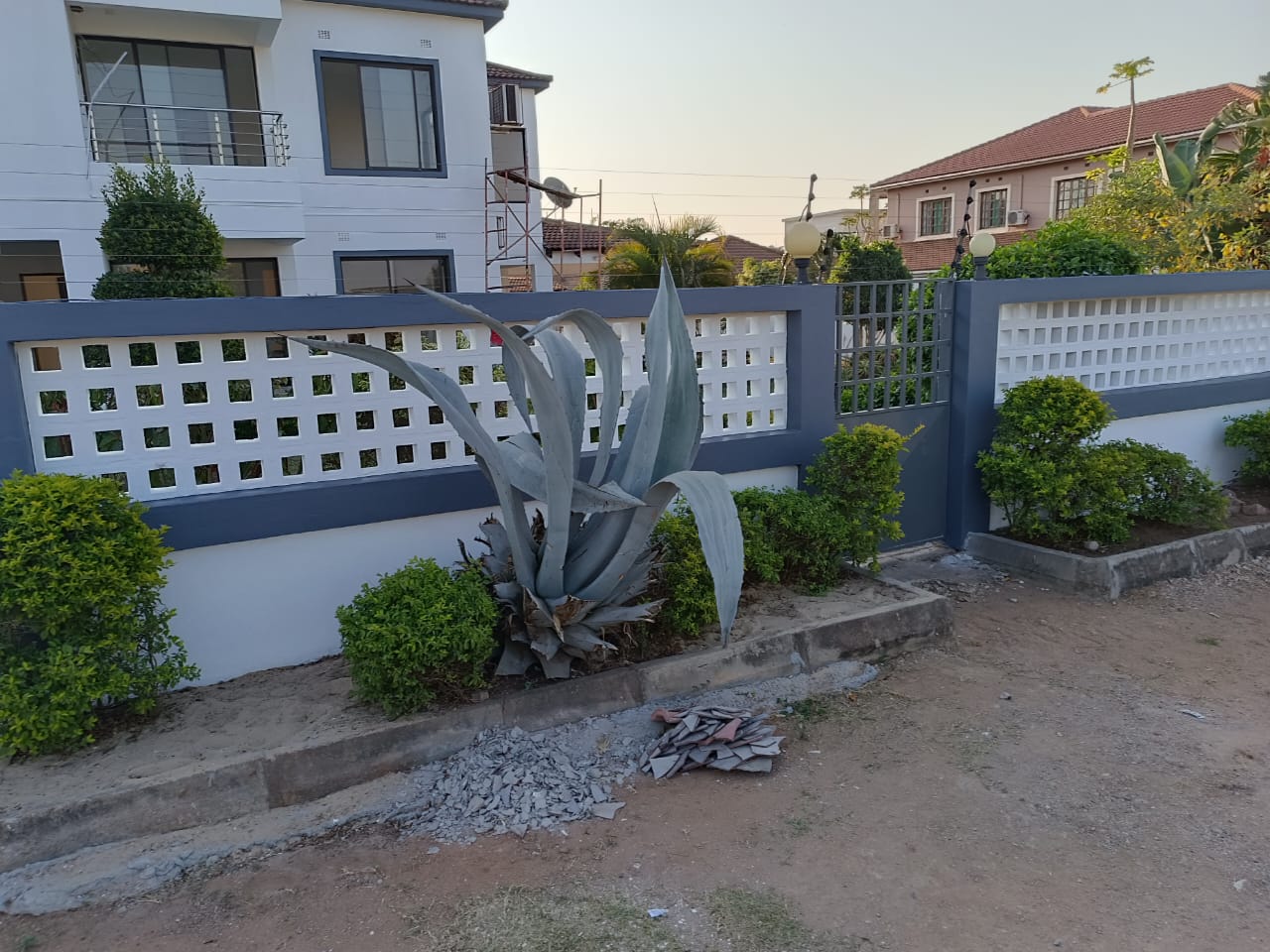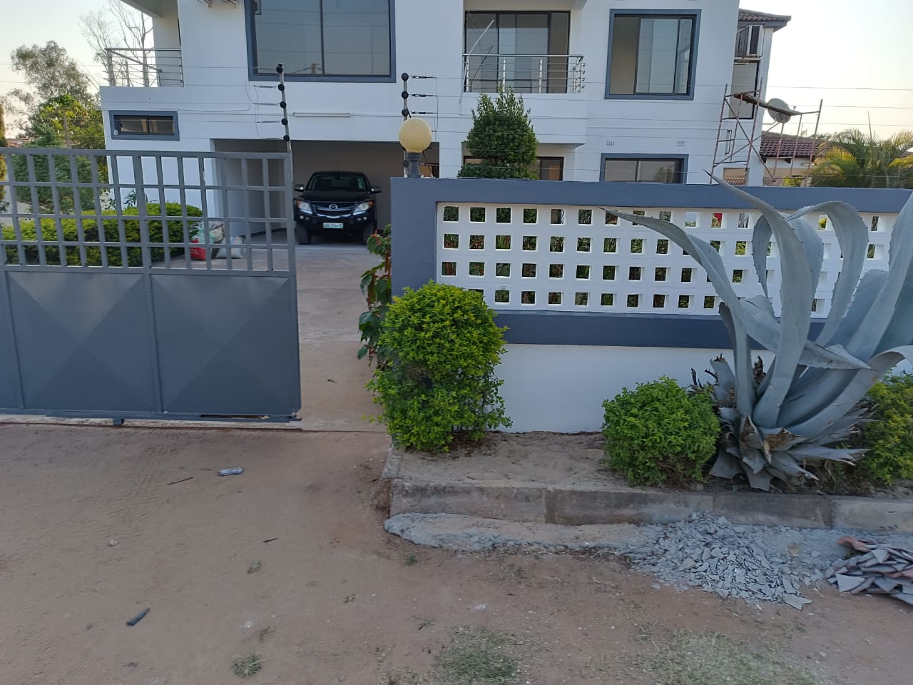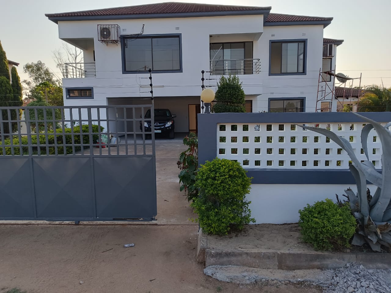Vivenda T4, na Matola Rio totalmente reabilitada e pronta para habitar ou escritorios, res-do- chao: 1 suite, 1 sala de estar e Uma sala de jantar, 1 cozinha americana, 1 cozinha extra de apoio, 1 casa de banho de serviço, 1 varanda para pelo menos 50 pessoas, 1 jardim enorme, 2 tanques para agua sendo 1 de 5 mil litros e outro de 2.500 litros, 1 quarto para empregado com respectiva casa de banho. No 1 andar: 3 suites, 1 sala de estar, 1 varanda e 1 ante- sala. Todos os quartos e salas com ar condicionados novos, agua quente em todos os quartos, estacionamento para 4 carros, num espaço de 35×40.